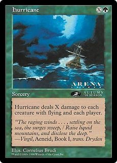 HURRICANE XG Sorcery Hurricane deals X damage to each creature and each player. "The raging winds..., settling on the sea, the surges sweep, / Raise liquid mountains, and disclose the deep." —Virgil, Aeneid, Book I, trans. Dryden |