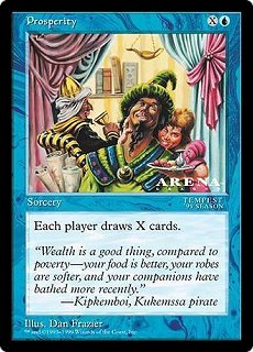 PROSPERITY XU Sorcery Each player draws X cards. "Wealth is a good thing, compared to poverty—your food is better, your robes are softer, and your companions have bathed more recently." —Kipkemboi, Kukemssa pirate |