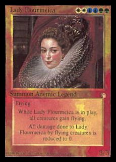 LADY FLOURMEICA WWUUGG Summon Anemic Legend (3/3) Flying While Lady Flourmeica is in play, all creature gain flying. All damage done to Lady Flourmeica by flying creatures is reduced to 0. |