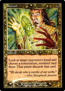 | DURESS B Sorcery Look at target opponent's hand and choose a noncreature, nonland card there. That player discards that card. "We decide who is worthy of our works." —Gix, Yawgmoth praetor |