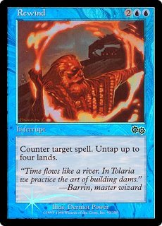 REWIND 2UU Interrupt Counter target spell. Untap up to four lands. "Time flows like a river. In Tolaria, we practice the art of building dams." —Barrin, master wizard |