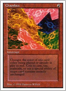 CHAOSLACE R Interrupt Changes the color of one card either being played or already in play to red. Cost to cast, tap, maintain, or use a special ability of target card remains entirely unchanged. |